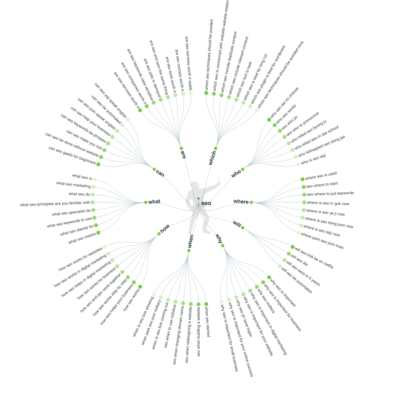 The results on Answer The Public are nice and visual and quite in depth, offering a series of data, including: