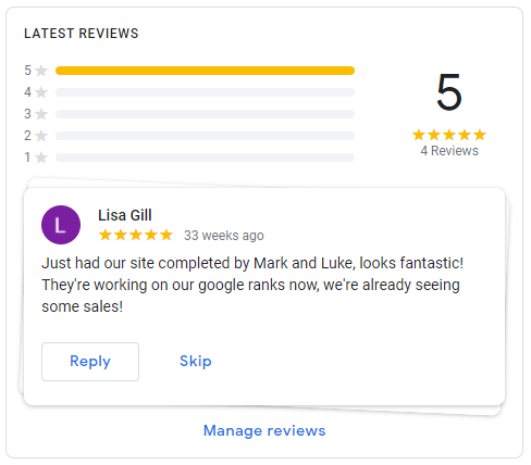 Managing your Google reviews is easy from your Google My Business dashboard where you can see average ratings and reply to any recent reviews. We’ve included it in our measuring as it’s often overlooked by businesses!