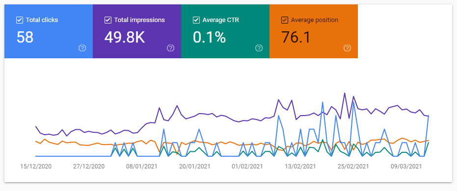 Impressions relates to the number of times your website has been listed (and in view) on someone’s Google search results. It’s worth noting here that impressions don’t always result in clicks, or conversions. For example, if your site ranks for a highly niche term with buyer intent then you’re in a much better position than if you were to rank for a high volume, generic term that doesn’t convert.