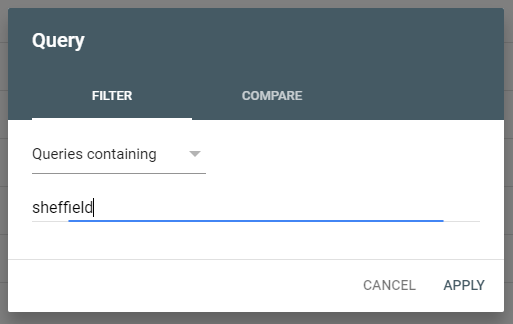 - In the ‘Keyword’ line, enter the area you would like to filter for, in our example we’ve added ‘Sheffield’. Don’t worry, filtering isn’t case sensitive.