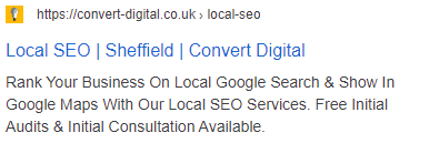 We find the easiest way to write a punchy Meta Description is to bullet point the key features of the page (including benefits) and use those as sentences. Take a look at our example above, the description lets the reader know exactly what our service does and how it benefits them. We’ve also included a little sweetener, in the form of a ‘Free Initial Consultation’; you could also use a good old call to action too.