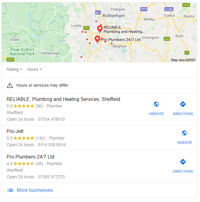 Local SEO is usually displayed alongside a map, with Google’s ‘Map Pack’ or ‘Local Pack’ being a prime example. When you make a local SEO search (such as a Service In Location search) you’ll notice that the top three organic results are displayed on a map. Optimising for local SEO can help you display in these results, which can be vital as they’re increasingly becoming the highest ranking results on SERP’s.